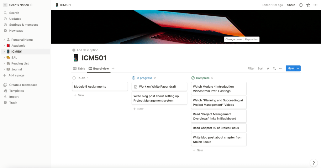 In starting with Notion, I decided to create a page to organize my work and assignments for my graduate course. The Kanban approach to project management is one that I have found to be truly helpful. In this project management application, I am able to list my tasks and visualize each stage of progress. I have also started to use the kanban approach for my overall academic assignments, alongside management of a student organization.