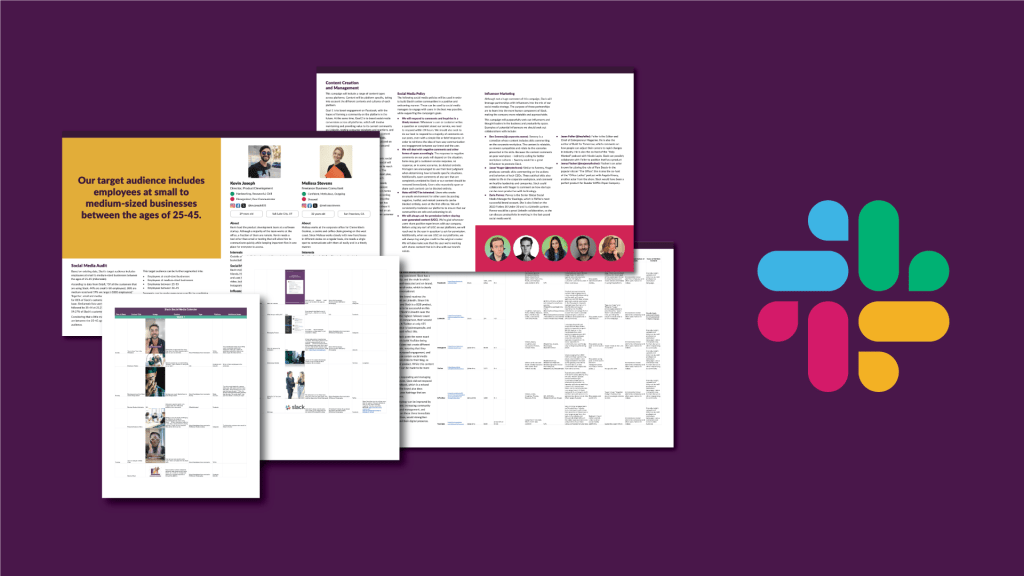 Just like any campaign, everything starts with research. In conducting an audit of all of the brand’s current platforms, I calculated the averages of likes, comments, and followers, and also analyzed the effectiveness of their current content. After compiling all the evidence, I discovered that Slack posts the same type of content across all their platforms, which is a missed opportunity to effectively communicate on a platform-specific basis. I also found out that Slack is extremely effective on LinkedIn, having accumulated a solid following of 2 million users.