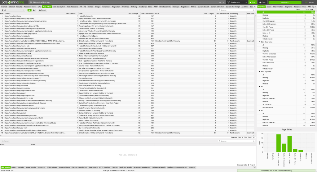 Screaming Frog crawled up to 500 pages of the Habitat for Humanity website for me. In the end, it gave me loads of information, such as page titles, meta descriptions, and headings on each of those pages. This allowed me to analyze how effective the organization is in describing their content, which is important for SEO.