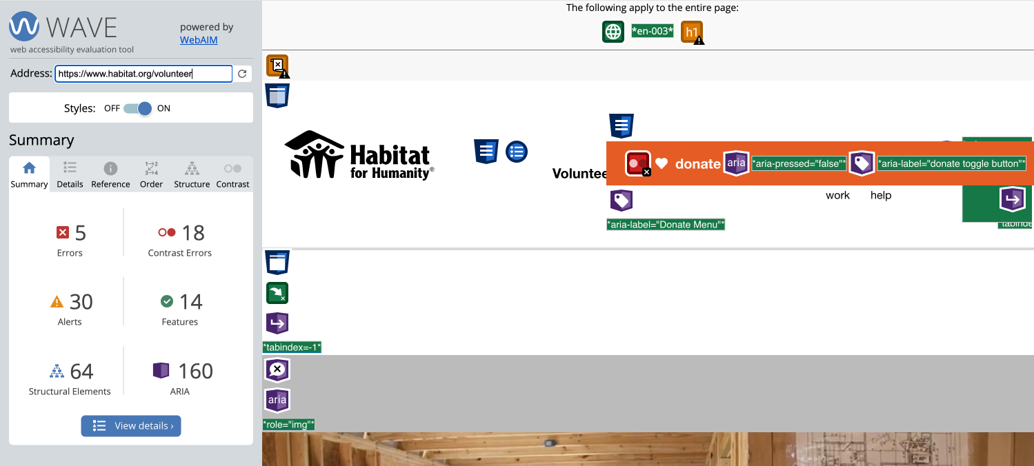 WAVE analyzes one page at a time to see what works in terms of web accessibility. According to the World Wide Web Consortium, “Web accessibility means that websites, tools, and technologies are designed and developed so that people with disabilities can use them.” WAVE was able to find what on the Habitat site met standards, and what could be fixed to make the website more accessible.