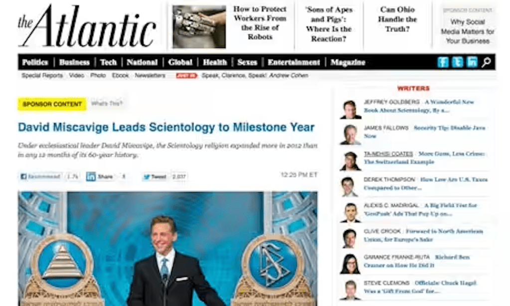 According to an article by Hal Conick for the American Marketing Association, The Atlantic ran a native advertisement – basically, an ad that doesn’t look like an ad – on their well-trusted website from the Church of Scientology back in 2016. The native advertisement looked exactly like an article from The Atlantic, misleading everyday viewers into thinking that it was a rigorous journalistic report. “Readers expected a piece of reported journalism about the religion” wrote Conick, “and instead got a laudatory piece of content marketing.”