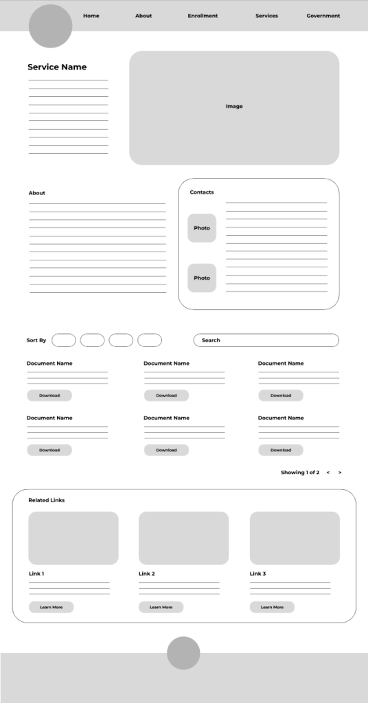 I love building websites, and wireframes are an essential part of the process. According to an article for Webflow by Jeff Cardello, “a wireframe represents the blueprint for a single page (or group of pages).” For the CSKT website, I created three wireframes for three types of pages that would be found on the site.