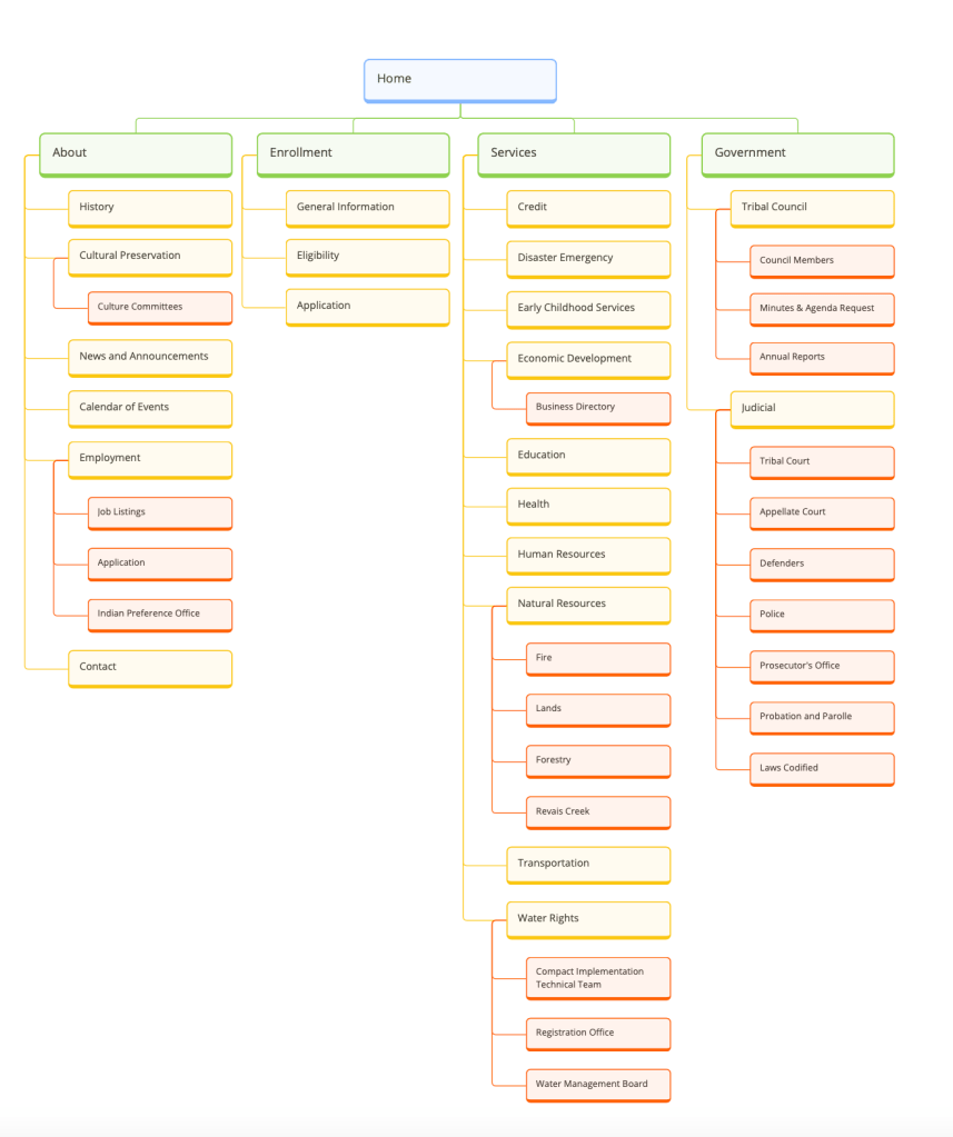 In creating the sitemap, I reorganized all of the pages into 4 categories: about, enrollment, services, and government. These 4 options consolidated existing pages into their categories, and made it clear what each one meant. For example, while Judicial is currently its own menu option on the website, in this proposed sitemap, it would instead fall under the Government page along with information about the Tribal Council.