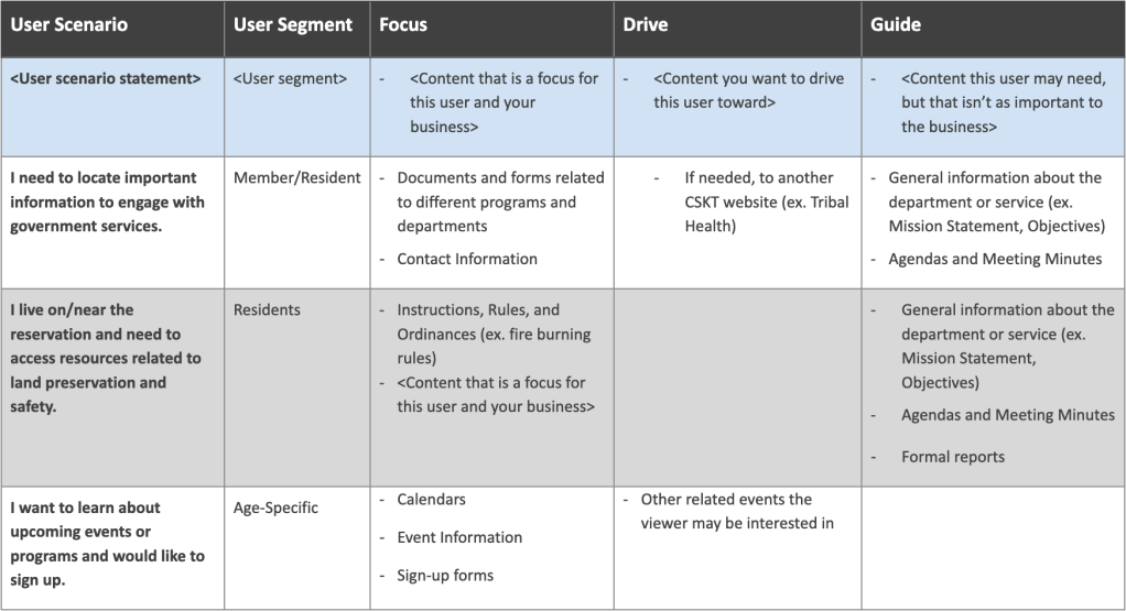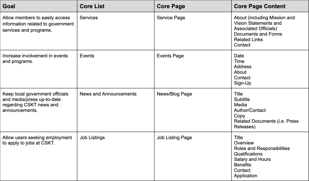 In the case of CSKT, the core lists under the new sitemap would be fairly simple, as it mainly includes events (which is where I got the example for above) and services. In the case of government services, there would be a core list of services with core pages for each. Each services page would have the same core page content components, which would serve the goal of the content strategy.