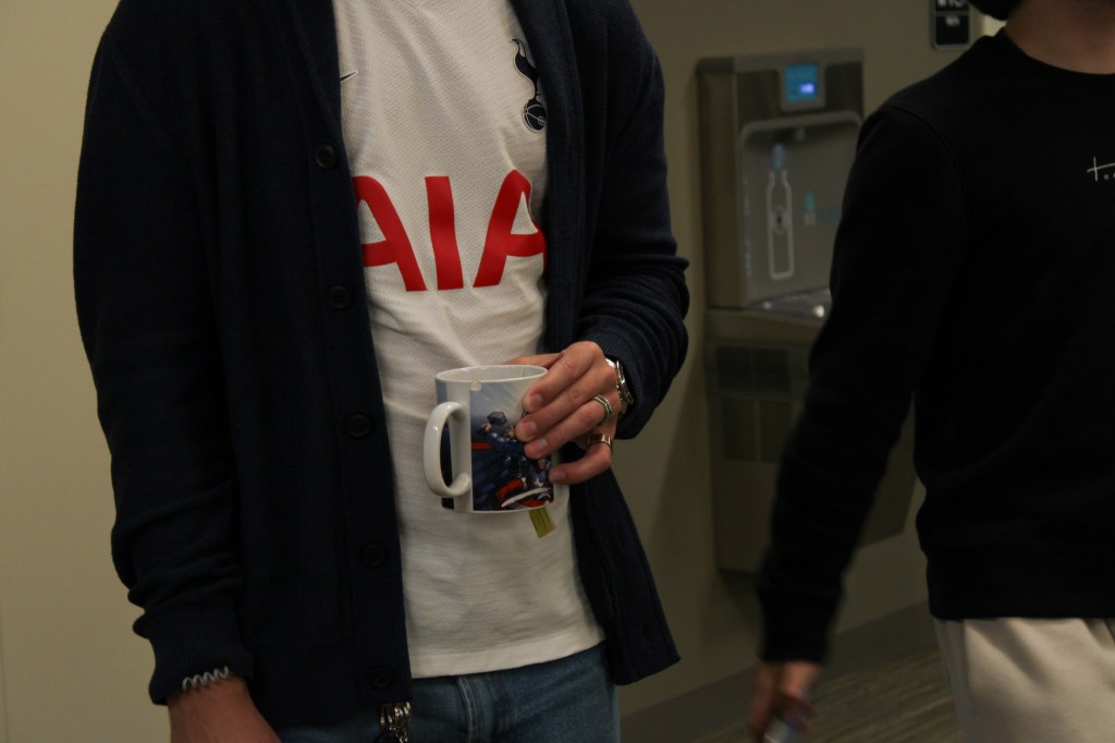 Rocco arrives at the rehearsal with a Marvel-themed mug in his hand. Because of the late-night rehearsal time, it is also common for members to bring snacks – even meals – to rehearsals. Less common, however, is the bringing of a cup of tea, but this choice makes sense given the cold and rain of this particular November evening.