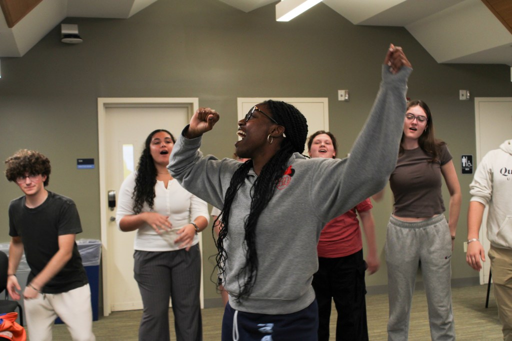 In this picture, Rocco, the performance coordinator, demonstrates a specific hand motion that will be used in one of the songs. The choreography for all of the group’s performances is created by the Performance Coordinator. It is also the responsibility of the PC to thereby teach the choreo.