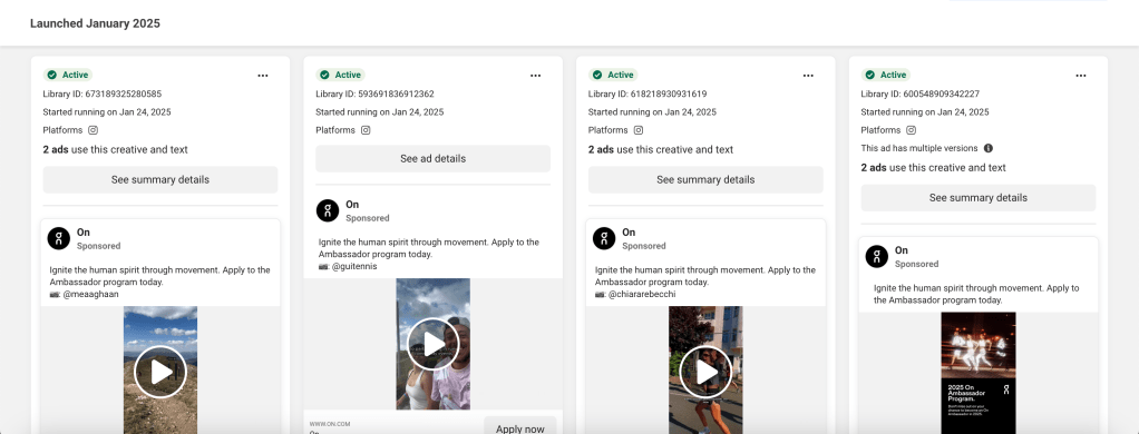 Notably, On’s most recent paid campaign features influencer-generated content promoting the On ambassador program, with the link going to a sign-up page for the program.