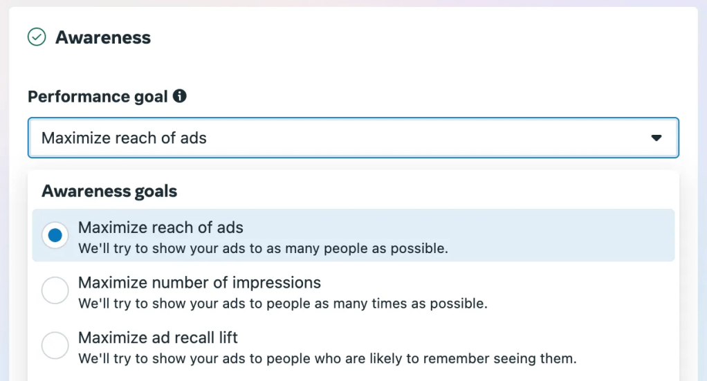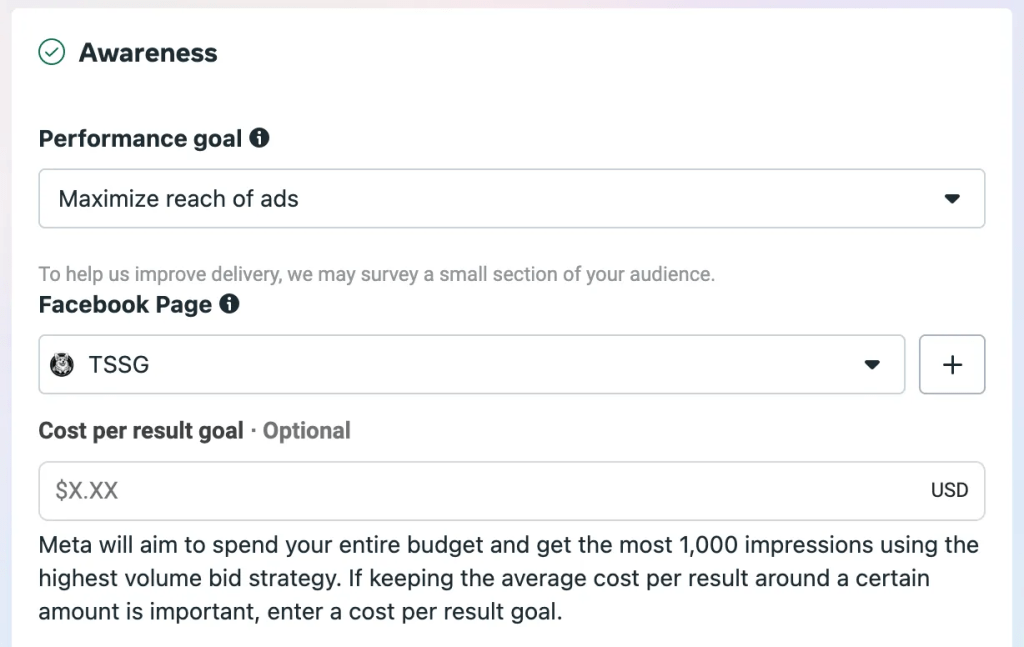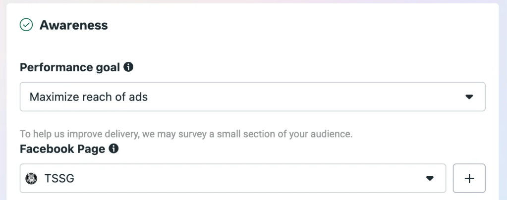 The next set of questions have to do with awareness. There are three goals to choose from for awareness (keeping in mind that the ad is a graphic and not a video).