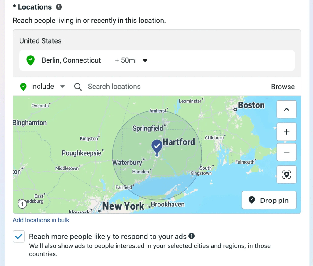 TSSG in located in Berlin, CT, although the company has clients all over the country. But in my mind, why not start local? It could help to build more relationships with other generator dealerships in the area, especially since we’re a younger business. Plus, if the ad does well here, we can later expand it to other areas of the country with the knowledge that the success could potentially translate. With this idea in mind, I set out target to a 50 mile radius around Berlin, which encompasses almost the entire state of Connecticut, and includes small areas of Massachusetts and New York. And, of course I’d like to “reach more people likely to respond to your ads.” Isn’t that the point? Leave this one checked, please.