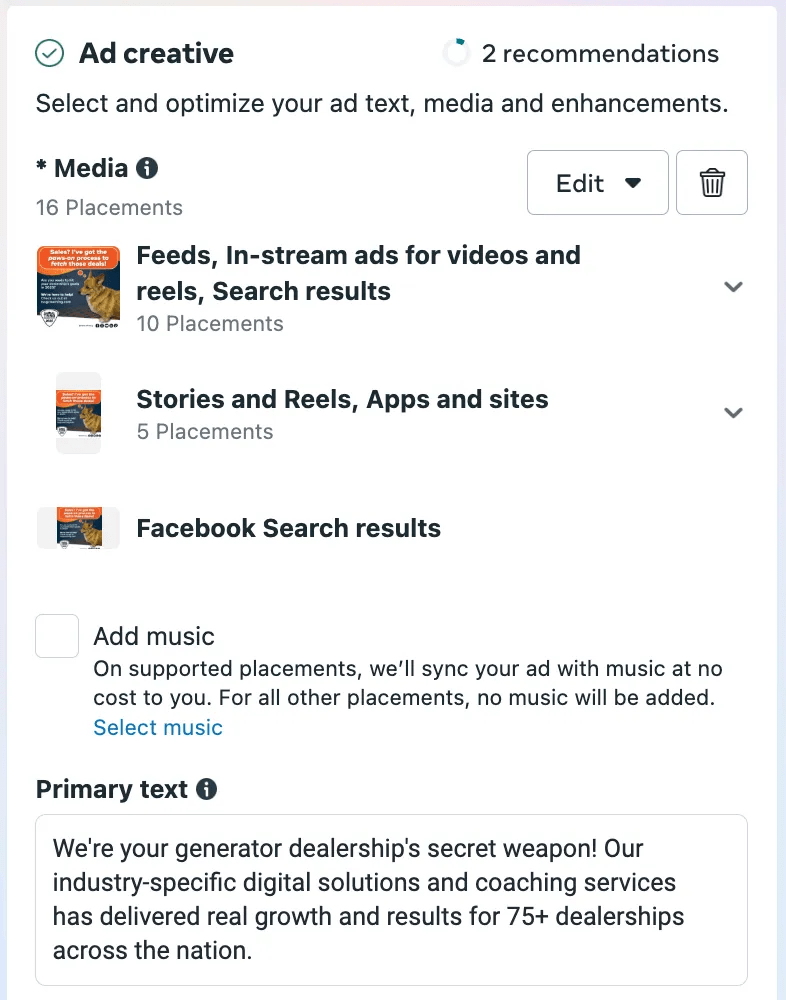 After dealing with location, I then start to target age. Since our target audience is 35-55 year olds, I set this to be the age range for the campaign. Gender is not important here – people of all genders work in the generator industry. I do, however, have to do some detailed targeting, to make sure this ad gets to the right people. An ad about generator dealer software won’t do much if it is seen by people who don’t even work in the industry. For interests, I target “sales,” “electric generator,” “HVAC,” and “electricity generation.” Finally, I check the box for “Advantage detailed targeting,” since it may be helpful for Facebook to expand upon this targeted audience if it means the ad could potentially perform better.