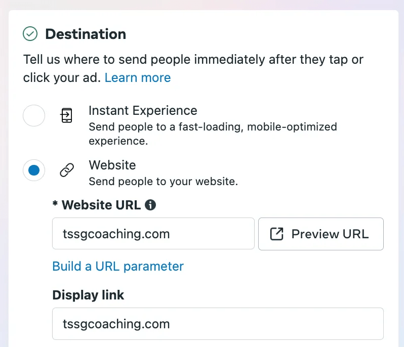 I then set the creative for the ad, as well as the link I want the “Learn More” CTA to drive to. It looks like I’ll have to create a version of the ad that will fit for stories and reels, too.