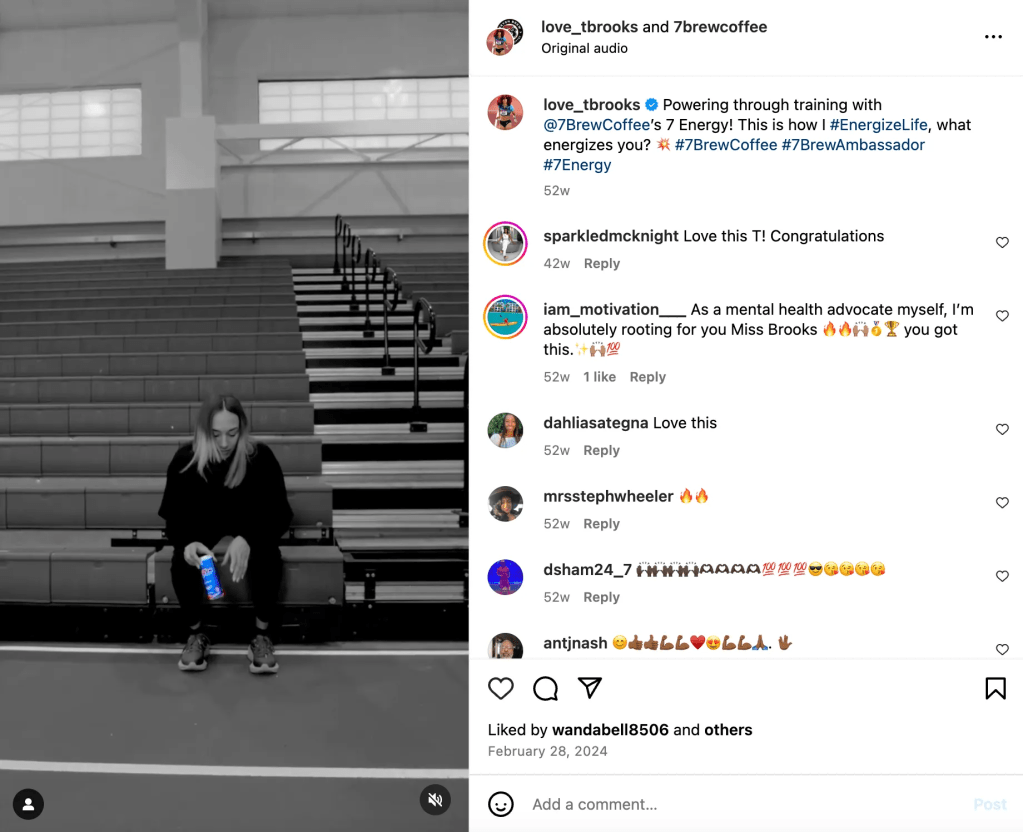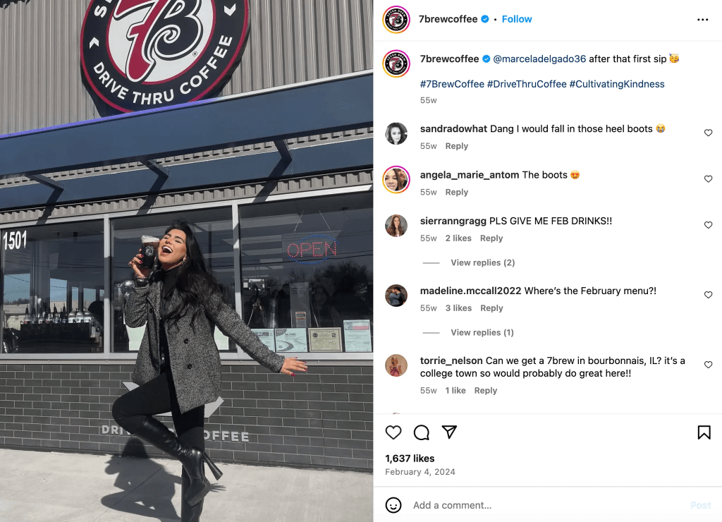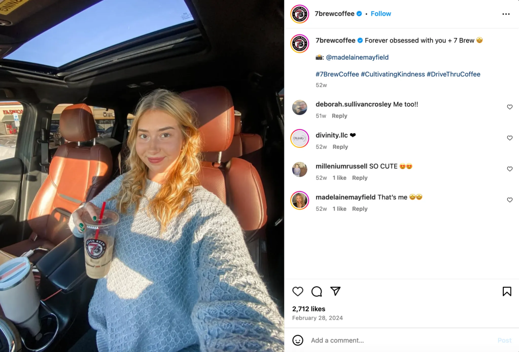 7 Brew has very engaging content and an energetic social presence. But they have yet to embrace the full opportunity of influencer marketing in the strategy. There are moments in the past that the brand has worked with influencers – but it was only for a short period of time. Once, they had a collaboration post with an Olympian.