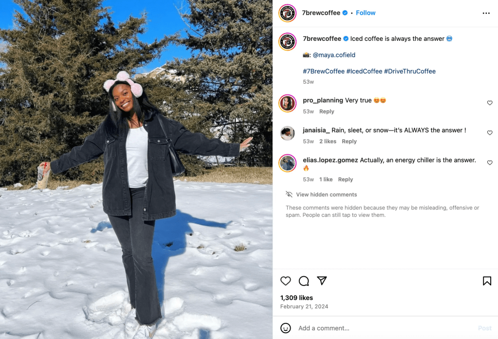 However, the brand doesn’t appear to have done any influencer posts since February 2024. Considering that the brand is growing, 7 Brew should expand their social strategy and take advantage of the opportunity to use influencer marketing.