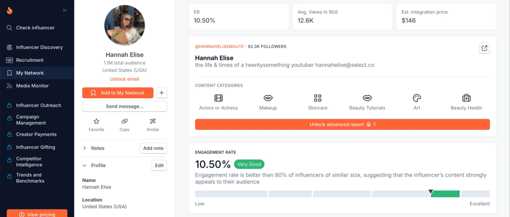 Unfortunately, since I only have the free version of HypeAuditor, it capped my limit after this search and a couple after. It did show me that found one creator, who had around 8k followers on Instagram, had an engagement rate of a mere 1% – making her a poor fit of a choice.